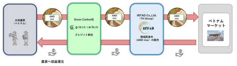 Green Carbon, Inc. (CEO: Jun Okita, hereinafter referred to as “Green Carbon”) has announced plans to expand business operations with INTAD Co., Ltd (Representative: Nguyen Bui Cong, hereinafter referred to as “INTAD”) to sell processed foods produced with “AWD rice” across Vietnamese markets through joint efforts with MOU. “AWD rice” is the latest addition to the environmentally sustainable agriculture business, which are rice crops farmed using the AWD (Alternate Wetting and Drying) farming method. INTAD has purchased the rights to “AWD rice” at a high unit price, while generating profit obtained from carbon credits which will flow towards Vietnamese farmers cultivating the rice.